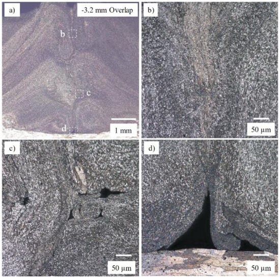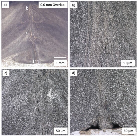 Figure 7 provides a higher magnification image of the overlap interface region for a build with a −3.2 mm overlap width. This corresponds to the build shown in Figure 3b and Figure 6b and Build B from Table 1. Figure 7a shows the same region as Figure 6b but is focused only on the interface. Figure 7b–d were captured using optical microscopy on the top, center, and bottom of the deposition interface, respectively. These images were taken at a high enough magnification to visualize individual grains ranging from the relatively elongated grains of the substrate to the sub-micron grains located at the very edges of the deposited material.