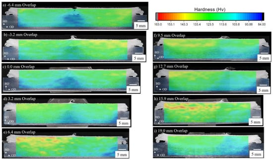 In addition to qualitative evaluation of the effect of a varying overlap region width, quantitative mechanical testing was performed on each build. Figure 9 shows the heat maps of the Vickers hardness of the cross-sections with varying overlap distances. There is a clear trend showing that the HAZ within the substrate is softer than the deposited material, forming a gradient between the top of the deposition and the substrate material. Many cross-sections also show that the initial pass (shown on the right side of each figure) has a lower hardness than the returning pass (shown on the left side of each figure). The TMAZ of the return pass mixes with a portion of the initial deposit, causing a uniform TMAZ for the return pass, while subjecting the initial deposition pass to additional heat. This new HAZ not only negatively impacts the previously deposited material, but also subjects the substrate and previous layers to large amounts of heat over a much longer period of time when compared to a single-pass deposition.