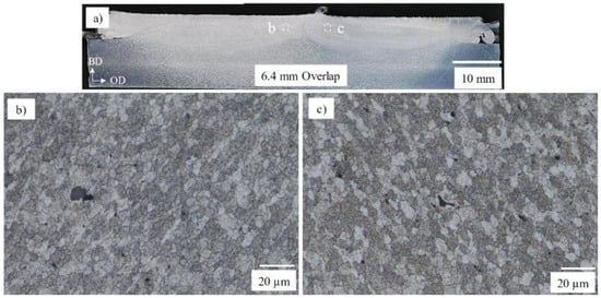 A ‘seam’ can be observed throughout each Image of Figure 7 that denotes where the two deposition passes meet and are forced against each other as the material flows outward from the tool path. In Figure 7b–d, the interface boundary contains very small grains compared to the rest of the deposited material. Also present at the interface are several relatively large voids, seen clearly in Figure 7c,d. These voids show that the flash material does not experience enough forces to properly mix and bond with the other side of the interface. The region shown in Figure 7b does not contain these voids because the material here has experienced higher compressive forces as the plumes flow into each other compared to the region in Figure 7c, where the plumes flow around each other.