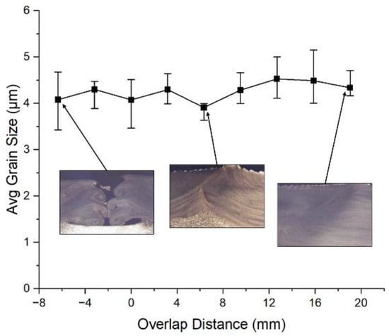 Figure 11 displays the relationship between the grain size and the deposition overlap distance, measured in mm, with the recorded scatter included for each cross-section. A negative overlap distance corresponds to a gap of the same magnitude. Although some of the tested regions have a relatively wide range of scatter, with the largest range being slightly larger than 1 µm, the average grain size remains consistently between 4 and 4.5 µm across all cross-sections. Similar to the collected hardness data, there is no observed trend relating grain size to overlap region width. This is expected, as all process parameters aside from the overlap region width were held constant between depositions. The observed range of grain sizes is also within the expected range for a 7XXX-series aluminum alloy processed with AFSD [39].