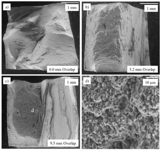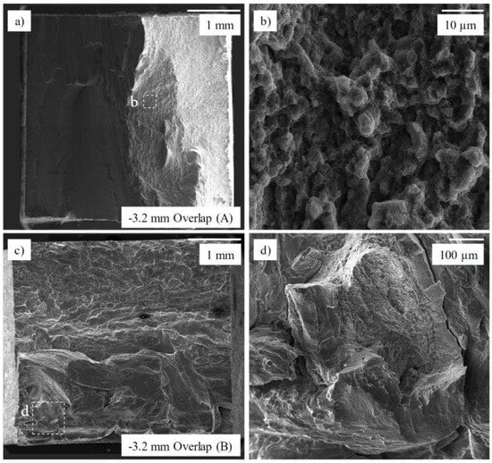 For each fractured tensile specimen, SEM was used to perform post-mortem analysis of the fracture surfaces. Figure 13a shows the fracture surface of the specimen with 0.0 mm of overlap (A), which had the lowest quantified performance. This image shows the central portion of the fracture surface undergoing ductile fracture by showcasing the cup-and-ball, or dimpling, features commonly seen with micro-void coalescence seen in ductile failure, but this image also shows a very high angle of fracture with many sharp, flat regions indicative of poor ductility. Figure 13b shows the fracture surface of the specimen with 3.2 mm of overlap (A), which has a larger region of typical ductile features covering the left half of the image and sharp ridges on the right side containing some small pockets of shallow dimpling. Figure 13c,d show the surface of the specimen with 9.5 mm of overlap (A), which had the highest yield and ultimate strengths of the tested specimens. Figure 13c shows similar behavior as Figure 13b, with half of the fracture surface covered by dimpling, showcased at a higher magnification in Figure 13d, while the rest of the surface shows several layers of ridge-like features.