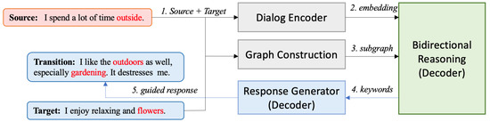 Figure 1: an encoder and two decoders. The first component is the dialog encoder, which utilizes a Transformer encoder to encode both the source and target utterances into an embedding vector. The encoder plays a fundamental role in capturing the semantic information of the dialogs, which arises from its attention mechanism for long-range dependency capture, scalability, and parallelization, coupled with positional encoding and self-attention for semantic comprehension. Our method’s following steps (bidirectional reasoning and response generation) are based on the output embedding generated by the dialog encoder. The second component is a bidirectional reasoning decoder. A graph neural network initially encodes the dialog subgraph constructed during the data preprocessing stage. Following this, the dialog embedding vector obtained from the dialog encoder is input into the decoder, and an attention mechanism [