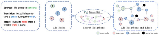 Furthermore, the decoding stop condition of the decoder is as follows. (1) When encountering a specially marked node added to the neighbor nodes of , the decoder will regard as a legal candidate node and automatically stop decoding when is selected. (2) The cue words set z exceeds . Moreover, we set all probabilities extracted in step to 0 to avoid repeated extractions.