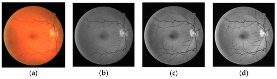 - In this study, the fundus images are separated into RGB three-channel feature maps. It was found that the green channel exhibited moderate brightness and better contrast between blood vessels and the background, in comparison to the other channels [43,44]. Consequently, the fundus vascular images with green channels were selected as the post-processing images.