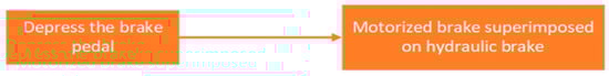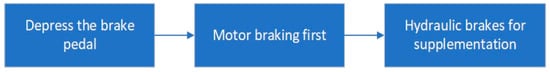 In the additive regenerative braking system (RBS), the brake pedal force and the hydraulic pressure in the brake wheel cylinder are not decoupled. As shown in Figure 2, when the brake pedal is pressed during the braking process, the brake wheel cylinder generates hydraulic braking force, with the motor braking being simply added to supplement this force. Consequently, there is still some energy loss, resulting in a lower energy recovery rate [17,18,19].