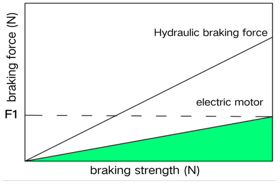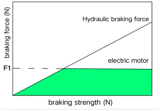 The main distinction between the two systems is whether the brake pedal is decoupled from the brake actuator. In the braking scenario of an electric vehicle, the braking torque is derived from two sources: hydraulic braking generated by the brake wheel cylinder, and regenerative braking provided by the motor through the drive shaft [20,21]. In Figure 4, when the brake pedal and brake actuator are not decoupled, regenerative braking is applied in addition to hydraulic braking during light braking. However, due to limitations, regenerative braking results in some energy loss and incomplete energy recovery. Conversely, when the brake pedal and brake actuator are decoupled, regenerative braking is initially employed during the braking process. If the required braking force exceeds the regenerative braking force (F1) of the motor, hydraulic braking is then utilized as auxiliary braking. This enables regenerative braking to be present throughout the entire braking process, maximizing the recovery of braking energy.