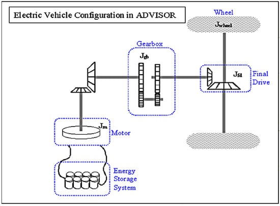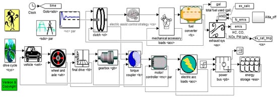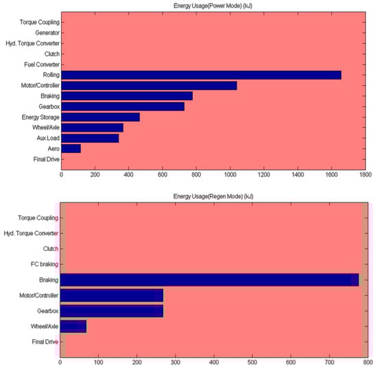 Upon successful creation of the simulation model in ADVISOR, the drive train model of the underground mining vehicle can be exported, as depicted in Figure 9. This illustration visually represents the internal structure of the vehicle, showing how the power is directly supplied by the battery to the engine for propulsion. Furthermore, conducting cyclic operating conditions yields an energy consumption diagram, as shown in Figure 10. This diagram provides a comprehensive overview of the energy consumption patterns during the vehicle’s operation. By conducting a comparison calculation between the energy consumption generated by each component of the vehicle during the driving process and the energy consumption recovered by the vehicle, it becomes evident that the integration of braking energy recovery technology significantly reduces energy waste in the operations of the underground mining vehicle. This finding underscores the effectiveness of braking energy recovery in enhancing energy efficiency.