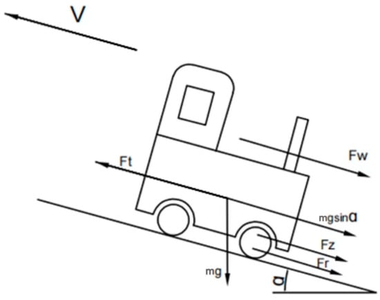 As shown in Figure 8, the force analysis diagram of the mining vehicle indicates that during normal operation, the vehicle experiences traction force provided by the traction motor , frictional resistance between the wheels and the track , air resistance , gravitational force mg, and bearing friction . According to Newton’s second law,