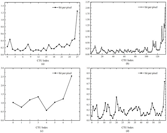 While the HEVC coding standard adopts the first mode of rate control as its intra-mode, the VVC standard uses the second mode for its intra-mode, which is also known as Bitrate-based Rate Control. In this mode, the value of λ for each CTU will be calculated based on the number of remaining bits of that CTU and the parameters α, β, and γ (limiting the number of bit counts at the frame and image level). In this way, the remaining bit count will be equally distributed to each CTU to achieve the target bit rate for the whole frame. This ensures that the image quality is balanced across CTUs and reduces the space occupation. However, the research in [30] mentions the phenomenon that in the actual coding process, the bit cost of the last one of a set of CTUs to be assigned is often much larger than the bit cost of all the preceding CTUs. Some of the results of the verification using the official test sequences provided by the VVC standard with the default rate control algorithm turned on in the coding mode of all intra are shown in Figure 2. In the figure, we use some of the official test sequences to observe the bit cost allocation per CTU under different bit cost conditions in intra mode.