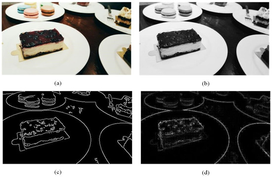 Significance information extraction using mv5 as an example. (a) original image; (b) grayscale image; (c) significant map based on Canny algorithm; and (d) significant map based on color contrast algorithm.