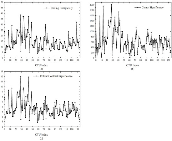 It should be noted that although the Laplace operator emphasizes high-frequency information and regions with large brightness variations, this saliency detection algorithm still has some problems. First, it is sensitive to noise and requires some noise suppression processing; second, the discretization matrix of the Laplace operator introduces a sharpening effect when processing the image, which may lead to some unnecessary details in the saliency map. Therefore, this experiment uses the Canny algorithm with SATD-based coding complexity together with the Laplacian operator to guide the selection of improved CTUs. The Canny significance value, color contrast significance value, and coding complexity information obtained for mv5 as an example are shown in Figure 5. From the metrics obtained in the three ways, it can be seen that the metrics converging to half of all CTUs in the frame are the more obvious ones, and they should be assigned more than the average number of bits, whereas all three metrics of the last CTU are significantly low, not even up to the average, and it is clearly not reasonable to assign the extreme bit cost to the last CTU.