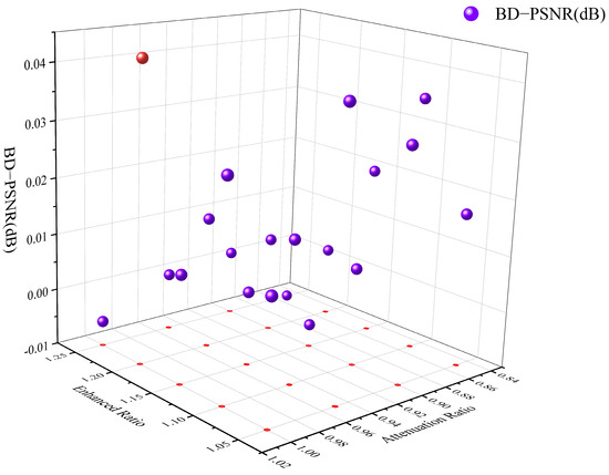 Among them, is the lifting parameter, is a parameter for reduction, K is the set of all improved CTUs, is the set of all CTUs for the frame, and the other parameters have been explained in (2). For the determination of the two, this experiment was fitted using a PLS regression model, which in turn determined the adjusted magnification of the improved CTUs. PLS regression is a multivariate statistical method for solving covariance problems. Its applicable scenario is when the number of two sets of variables is large, both of them are multi-correlated, and the number of observed data are small The model built by partial least squares regression has the advantages that traditional methods such as classical regression analysis do not have. The dataset first needs to be further expanded and information extracted by enhancing the bit allocation of the improved CTUs in the video in each dataset with different multiplicities and reducing the other CTUs in the same frame, respectively. After the coding of all the videos is completed, the multiplier that results in the most efficient improvement in the rate control of each video is used as the expansion of the dataset, which is the output of the PLS regression model. The improvement in rate control efficiency for the sequence mv5 in the dataset is shown in Figure 6, where the x-axis is the boosting multiplier, the y-axis corresponds to the decreasing multiplier, and the z-axis corresponds to the BD-PSNR, which is used to characterize the reconstruction pixel quality improvement. The highest value in the figure is 0.043 dB, which corresponds to the red data point, for the case of boosting multiplicity 1.2 and decreasing multiplicity 1.
