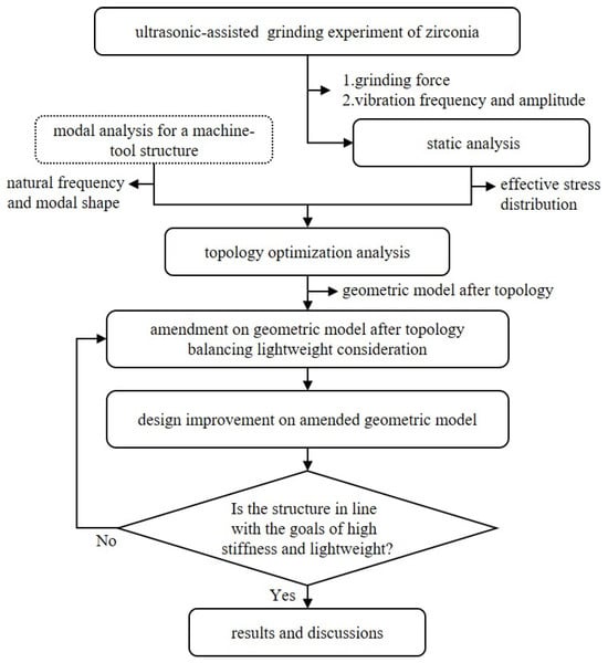 Machining characteristics were applied to topology optimization for machine tool structure design improvement in this study, and the goals of lightweight and high rigidity of the structure were achieved. Firstly, an ultrasonic-assisted grinding experiment was carried out on zirconia to investigate the surface roughness, surface morphology, grinding vibration, and forces. Then, the topology optimization analysis was conducted for structure design improvement, in which the magnitude of the grinding vibration was utilized as the reference for selecting the topology subsystems and the grinding force was used as the boundary conditions of the static analysis in the topology optimization. Hence, columns, bases, and saddles were redesigned for structure stiffness improvement, and the variations in the effective stress, natural frequency, weight, and stiffness of the whole machine tool were compared accordingly. The results showed that the deduced topological shape (model) can make the natural frequency and stiffness of the whole machine tool tend to be stable and convergent with a weight retention rate more than 75% as the design constraint. The subsystem structures with larger effective stress distributions were designated for stiffness improvement in the design. At the same time, the topological shape (model) was also employed in the design for weight reduction, focusing on minimizing redundant materials within the structure. In contrast to the consistency of the modal shapes before and after topological analysis, the sequential number of the modal mode of the machine tool model after topological analysis was advanced by two modes relative to those of the original situation, which means the original machine tool may be out of its inherently resonant frequency range. Also, the natural frequencies corresponding to each mode had an increasing tendency, and the maximum increase was 110.28%. Furthermore, the stiffness of the machine tool also increased significantly, with a maximum of 355.97%, leading to minor changes of the machine tool’s weight. These results confirm that the topology optimization based on machining characteristics proposed in this study for structure redesign improvement and stiffness enhancement is effective and feasible.