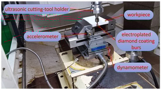 The schematic and images of the experimental setup for ultrasonic-assisted grinding of a difficult-to-cut material such as zirconia are shown in Figure 4 and Figure 5, respectively. A dynamometer (Kistler 9257B, Kistler Group, Winterthur, Switzerland) is mounted between the worktable and the vice-fixture to monitor the grinding forces. The signal detected from the dynamometer is transmitted to a charge amplifier (Kistler 5070A) and a signal acquisition card (NI-9215, National Instruments Co., Austin, TX, USA), and finally, it is recorded on a laptop for the measurement of grinding forces. Grinding vibrations are detected using a three-axis accelerometer (B&K 4506B, Brüel & Kjær, Nærum, Denmark) to capture the relative vibrations between the workpiece and grinding tool. Its signal is then transmitted to a spectrum analyzer (B&K 3560C) and recorded on a laptop for the measurement of grinding vibrations. The grinding process parameters for the experiment are planned as shown in Table 1. Additionally, the hammer impact on each subsystem of casting iron and the whole machine tool for experimental modal analysis (EMA) was carried out in this study. As a result, the modal parameters of the structure can be obtained from the analysis results, and the corresponding modal shape of the structure can be established accordingly.