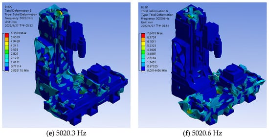 The vibration signals along different axial directions detected from ultrasonic-assisted roughing grinding of zirconia are shown in Figure 6. It can be observed that the vibration along the x-axis is not pronounced, while the vibration along the y-axis exhibits a slight vibration between 4 k to 6 kHz. The vibration along the z-axis is more prominent, particularly concentrated around 5 kHz. Therefore, 5 kHz is recognized as a reference frequency for further investigation of the vibration modal shapes of the machine tool, as depicted in Figure 7. From the numerical modal analysis, the six modal shapes around 5 kHz for a machine tool system model are shown in Figure 7. It reveals that the larger vibration subsystems in this machine tool are the column, base, and saddle. Hence, these three subsystems were designated as the objects for subsequent topology optimization analysis to enhance the overall machine tool rigidity, pursuing the lightweight goal simultaneously.