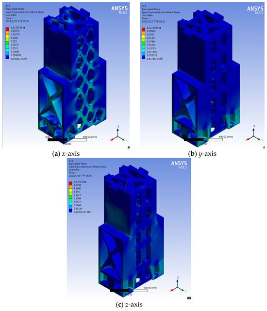 The equivalent stress distributions were individually determined for the column, base, and saddle subsystems along each axial direction for which the grinding forces were applied separately. The results of the effective stress obtained from the numerical simulations along the different axial directions for the column subsystem are shown in Figure 9, while those obtained for the base and saddle subsystems are shown in Figure 10 and Figure 11, respectively. From Figure 9, Figure 10 and Figure 11, it can be observed that stress concentrations always occurred around the structure turning corners or at the interfaces between the component connections, which may be regarded as the weak areas of the structure.