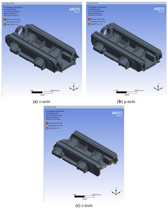 Figure 12, Figure 13 and Figure 14 show the individual geometric shapes (models) after topological analysis at a 75% weight retention rate for the column, base, and saddle subsystems along each axial direction, respectively. That is, by using the equivalent stress distributions obtained from the static analysis, the above analyses were subsequently performed, applying the 75% weight retention rate constraints and design variables.