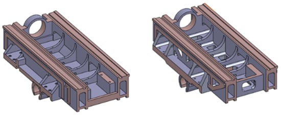 Taking the column subsystem as an example, Figure 15 and Figure 16 illustrate the geometrical models before and after the design improvements for the column subsystem, respectively. The capsule-pattern is altered by the rhombus pattern on the outer panel behind the column subsystem at the structural redesign reinforcement stage, which will more effectively withstand the cutting force impacts along the x-axis direction during machining. Moreover, a single-arm structure on both sides of the middle section of the column subsystem has been added, which may be better able to resist the impacts of cutting forces from the y-axis and z-axis directions during machining. This enhanced modification is based on the features of the effective stress distributions. Additionally, the protruding structures on both sides have been altered from the rectangular to trapezoidal shapes. Both lightweight and inner ribbed structure strengthening may be conducted and achieved simultaneously in this study. Similar structural redesign improvement procedures have also been applied to the base and saddle subsystem models, as depicted in Figure 17 and Figure 18, which follow the same design rule considerations and methods as the column subsystem.