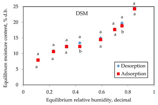 The mean values of the EMC of DSM and PFE at different relative humidities and temperatures studied during adsorption are presented in Table 1. EMC values raised with the increase in the relative humidity and the decrease in the temperature. The rise in the temperature increased the energy and mobility of water molecules [37,38]. This provoked the release of a higher number of molecules from the less active centers and thus resulted in a decrease in the EMC [39]. Similar trends for various biological materials were found in the literature [40], including for several extrudates [21,37].