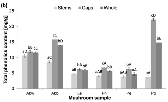 The content of total phenolics in the extracts from caps, stems and whole fruiting bodies, expressed per fruiting body dry weight (a) and per extract dry weight (b); Abw—A. bisporus (white), Abb—A. bisporus (brown), Le—L. edodes, Pn—P. nameko, Pe—P. eryngii, Po—P. ostreatus. Mean values (n = 3) with different lowercase letters show significant differences among the parts of mushrooms belonging to the same species. Mean values with different capital letters indicate significant differences among the same parts belonging to various species (p < 0.05, Tukey’s test).