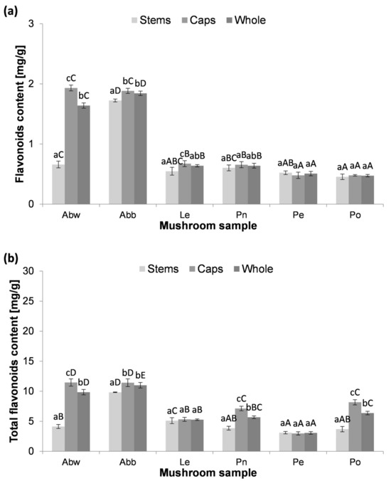 Flavonoids, belonging to the polyphenols, are commonly found in nature as dyes. Their presence has also been found in mushrooms. The content of flavonoids per gram of dry weight of the fruiting bodies is shown in Figure 2a. Among the whole fruiting bodies, the lowest concentrations were noticed in P. ostreatus and P. eryngii (0.47 ± 0.02 mg/g and 0.51 ± 0.04 mg/g, respectively), while the highest were in A. bisporus (brown) followed by A. bisporus (white) (1.84 ± 0.04 mg/g and 1.64 ± 0.04 mg/g, respectively). The results of A. bisporus support the previous findings in which their flavonoids level was recorded at ~1.7 mg/g [30]. On the other hand, Palacios et al. [23] reported similar amounts of flavonoids in A. bisporus and P. ostreatus (approximately 1 mg/g).