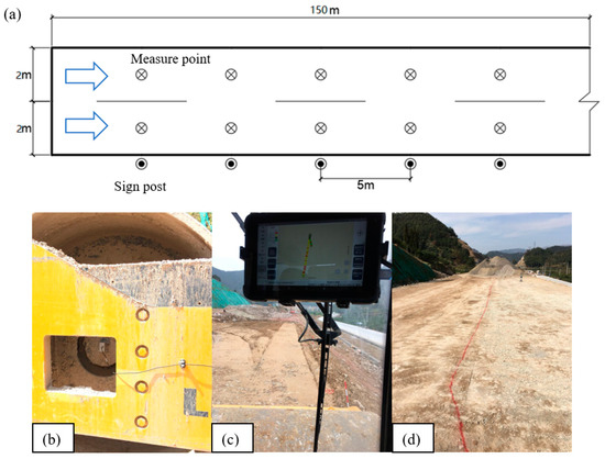The test field was constructed in Zhejiang, China. Figure 1a shows the distribution of test points. The test field area is 600 m2 (150 m × 4 m), divided into two rectangular test zones with a width of about 2 m. There are 15 measure points which is 5 m apart on each side. A signpost is used on one side of the test strip to determine the test location.
