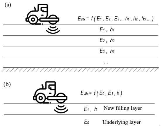 Because the action depth of the vibration wheel is greater than the thickness of the filling layer, vibration feedback to the vibration wheel actually reflects the overall compaction quality in a certain range below the roller surface, as shown in Figure 2a. The continuous compaction control index obtained is a function of the modulus and thickness of each filling layer, and Evib is calculated as Equation (1).