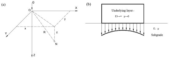 The above assumptions regard the subgrade as an elastic semi-infinite space body. When a vertical concentrated force Q acts on the surface of subgrade, the deflection of any point in the semi-infinite body can be obtained by Bussinick’s solution, as shown in Figure 3a. In the rectangular coordinate system, the vertical deformation of any point can be calculated as Equations (2) and (3) [17,29].