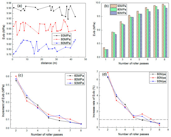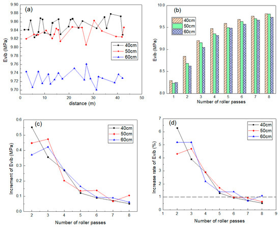 As shown in Figure 5d, it can be referred that increasing the subgrade strength mostly concentrates on the first four roller passes, and then, it increases slightly on the last four roller passes. According to the suggestion in Technical Conditions of Intelligent Compaction Control System for Highway Subgrade Filling Engineering [19], it can be determined that the strength reaches a stable state, in which the compaction quality will not be changed significantly again as the increased rate of Evib of two adjacent rollers does not exceed 1%.