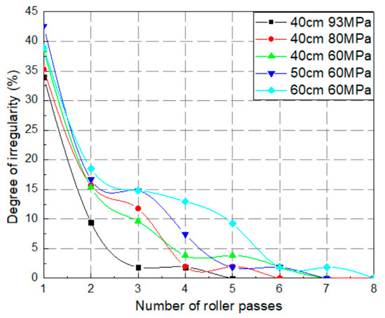 The coefficient η is 0.8; that is, if the continuous compaction control index value of each point is greater than 80% of the detection target value, it is considered that the current roller uniformity meets the requirements. Figure 7 shows that the influence of different working conditions on the compaction variability is obvious. At the beginning of rolling, the compaction variability of each working condition is higher and ranges from 32.5% to 42.5%. It was noted that the degree of irregularity in the condition of 40 cm thickness and 93 MPa strength decreases rapidly with roller passes, and the value becomes zero at five passes that means that the variability meets the requirement. Then, the condition of 40 cm thickness and 80 MPa strength has the same variation law, but it meets the variability requirement at six passes. Another three conditions of the data analysis are similar to the above two condition results. It was also found that with seven passes for the condition of 40 cm thickness and 60 MPa strength, 50 cm thickness and 60 MPa strength, and eight passes for 60 cm thickness and 60 MPa strength that the compaction variability reaches the standard. In view of compaction variability control, it was proven that increasing the strength of the underlying layer and reducing the thickness of the filling layer are beneficial to achieving a higher quality of the compaction state.