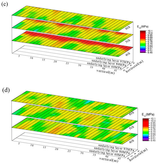 Figure 8. A 3D distribution map of compaction effect: (a) variation in Evib with the strength of underlying layer is 60 MPa, 80 MPa; (b) variation in Evc when the strength of underlying layer is 60 MPa, 80 MPa; (c) variation in Evib when the strength of underlying layer is 60 MPa, 80 MPa, 93 MPa; (d) variation in Evc when the strength of underlying layer is 60 MPa, 80 MPa, 93 MPa.