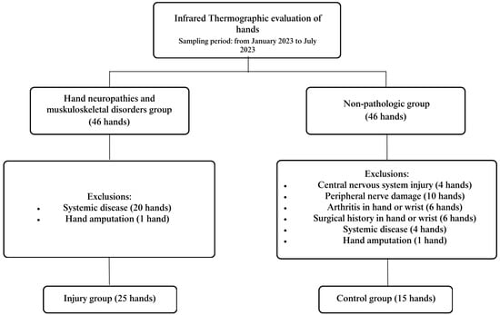 It is important to note that certain individuals were intentionally excluded from this study to maintain the specificity of the cohort. Patients with systemic diseases such as tumors, thyroid disorders, fibromyalgia, and uncontrolled diabetes mellitus were excluded. Additionally, individuals with hand amputations were excluded, as the absence of hands prevented the assessment of hand neuropathies and/or musculoskeletal disorders. This rigorous selection process aimed to enhance the internal validity of the study by minimising confounding factors, which may mask a real association or otherwise falsely demonstrate an association between the injury occurrence and the increase of temperature, and allowing a more accurate investigation of the specific conditions.