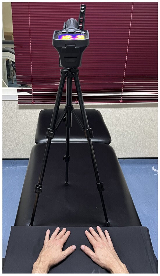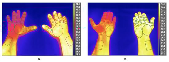 Throughout the process, the infrared camera was securely fixed on a stable support and set up at a right angle to the hands, at a distance of 0.7 m. The thermal images were captured while the volunteers were seated in a chair, with their hands resting on a table covered with a black sheet in two distinct projections, according to Figure 3, obtaining a minimum of five sequential images for each projection. First, an evaluation was performed on the dorsal surface, followed by a subsequent assessment of the palmar side after allowing it to cool down.