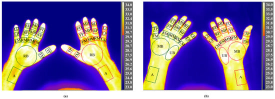 Thermal image with the regions of interest of the dorsal area (a) and palmar area (b). A—Arm; TM—Thumb metacarpophalangeal; TP—Thumb proximal; FM—Forefinger metacarpophalangeal; FP—Forefinger proximal; FD—Forefinger distal; MM—Middle metacarpophalangeal; MP—Middle proximal; MD—Middle distal; RM—Ring metacarpophalangeal; RP—Ring proximal; RD—Ring distal; LM—Little metacarpophalangeal; LP—Little proximal; LD—Little distal; RB—Radial branch; MB—Median branch; UB—Ulnar branch.