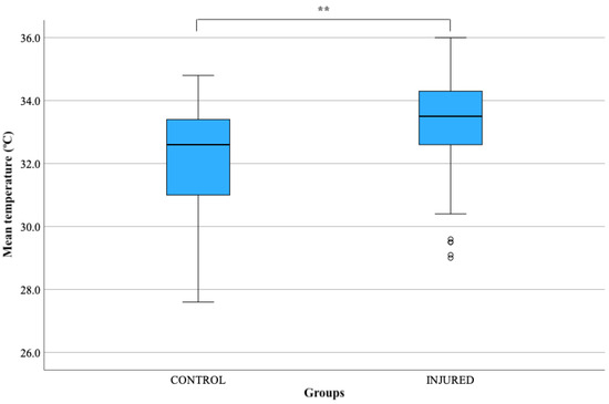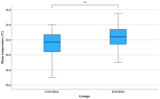 Box plot comparing the mean dorsum hand temperature between the control group and the injured group. ** p < 0.01.