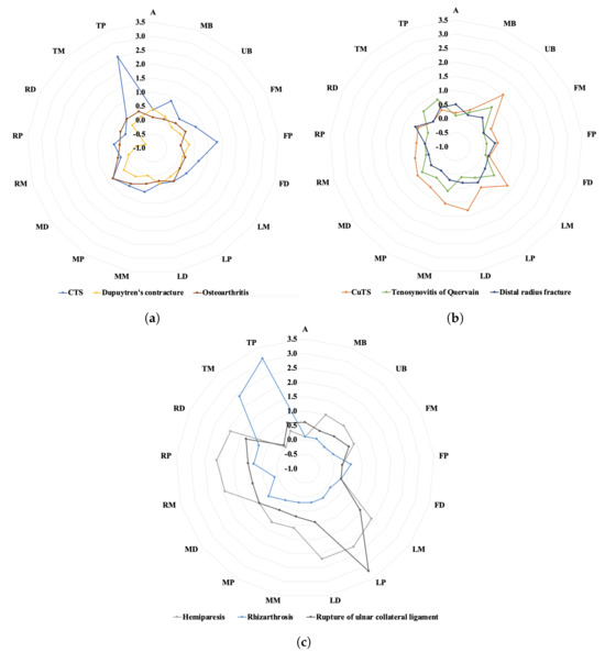 In order to investigate the potential of infrared thermography as a complementary and validating tool for diagnosing hand neuropathies and musculoskeletal disorders, the results were segmented by pathology to establish associations between thermal differences in specific hand regions. Due to the volume of information, which was extensive for inclusion in a single chart, the data were categorised into three subgroups: CTS, Dupuytren’s contracture, and Osteoarthritis; CuTS, Tenosynovitis of Quervain, and Distal radius fracture; and Hemiparesis, Rhizarthrosis, and Rupture of ulnar collateral ligament. Thus, three radar graphs illustrating thermal asymmetry between pathological hands and their healthy contralaterals were produced for each considered ROI, as illustrated in Figure 8. Participants with bilateral pathology were appropriately excluded from the dataset, since it would not be possible to compare the injured hand with the contralateral one.