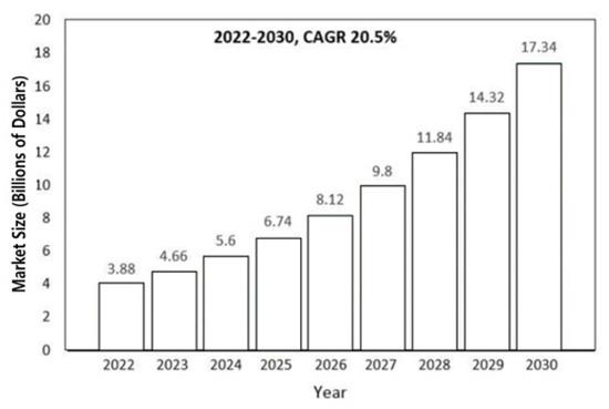 The existing patient-specific treatment device field is not as active as expected because of insufficiencies in the service ecosystem and structural limitations in the service operation at the independent application level. Therefore, it is necessary to combine biotechnology with information and communication technology (ICT), both of which are strong technologies in South Korea, to establish an ecosystem in the field of patient-specific treatment devices, such as the newly developed motion-analysis system. Figure 1 shows that the global market for digital therapy reached USD 3.23 billion in 2021 from USD 2.7 billion in 2020. It is expected to reach USD 4.66 billion by 2023 and USD 17.34 billion by 2030. The compound annual growth rate (CAGR) for the digital therapy market is 20.5%, which is significantly higher than that of the general pharmaceutical market. However, the digital therapy market has different forecasts for each institution. As a result, there are limitations in predicting the exact market size or growth rate. This technology, which combines information technology with existing medical and pharmaceutical technologies, is considered an alternative tool for overcoming the limitations of existing medical treatments; therefore, its market growth rate is significantly higher than that of the existing medical industry market [1]. In particular, the patient-specific treatment device market is expected to reach approximately USD 4.2 billion by 2021, with a CAGR of 26.1% from 2022 to 2030, because of increased demand for cost-effective digital health technology, integrated medical systems, and patient-centered care for patients in developed and developing countries. To solve medical accessibility problems such as those for degenerative brain diseases, mental diseases, and psychological (mental) disorders caused by aging, it is necessary to establish a patient-specific medical service demonstration and support system, such as a motion-analysis system. Therefore, multi-disciplinary research and development projects are needed to demonstrate patient-specific treatment devices. This is an urgent time for international exchanges because they must lay a foundation that cannot be accessed at the private level [2].