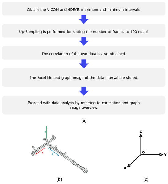 Since it is difficult to accurately determine the operation timing of the 4DEYE and VICON systems, the minimum and maximum areas of each data point were analyzed at the same time and compared with each other. In addition, after selecting one representative indicator of 4DEYE and VICON, the minimum and maximum areas of the indicator were applied to all indicators. Up-sampling was performed to match the same 100 frames of 4DEYE and VICON using MATLAB because of the difference in the number of image frames between 4DEYE and VICON. The correlation between the two data types was obtained and the data were analyzed according to the correlation with the graph image; the measurement process is shown in Figure 2a.