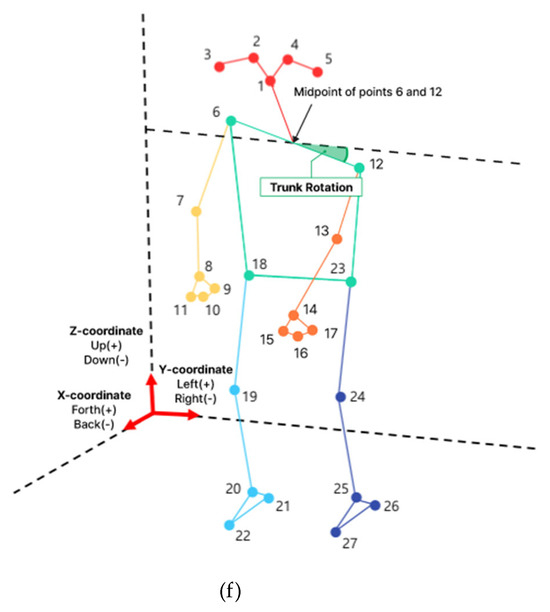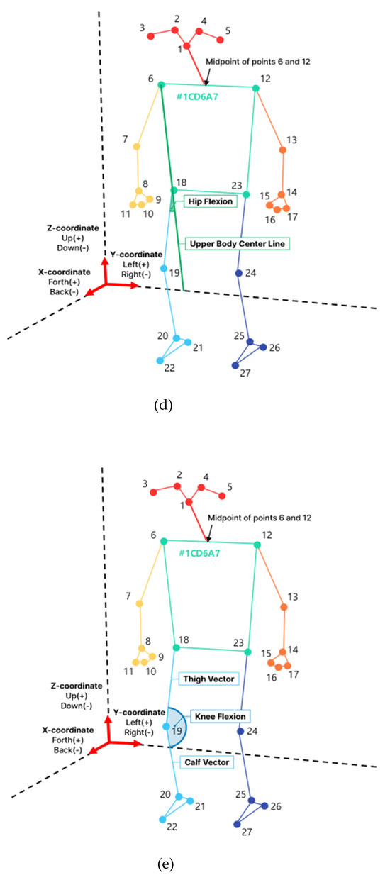 Hip flexion measures the angle of the hip-joint vector (the line connecting the hips and knees) compared to the upper-body-center line (the line connecting the center of both shoulders and the center of both hip joints on the z-axis). The picture above shows the right side as an example, so for convenience, it is assumed that the upper-body-center line has been moved parallel to the right. Therefore, hip flexion measures the angle of the thigh vector (line connecting numbers 18 and 19 in Figure 2d) compared to the upper-body-center line moved parallel to the right. Knee flexion measures the angle between the thigh vector (the line connecting numbers 18 and 19 in Figure 2e) and the calf vector (the line connecting 19 and 20 in the picture). Trunk rotation measures the angle between the y-axis (left and right reference lines) and the straight line connecting both shoulders (line connecting numbers 6 and 12 in Figure 2f) on the horizontal plane (x–y plane).