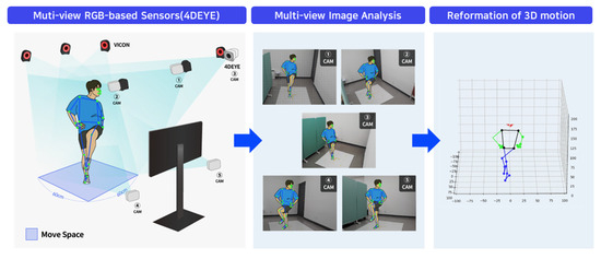 In general, the RGB sensor system combines a 3D reconstruction algorithm based on a deep learning multi-view 2D image to estimate a 3D posture. RGB-D sensors for quantitative evaluation or motion analysis can be a good alternative to existing sensors [20], and commercial RGB sensor devices with motion analysis describes 4DEYE®. Existing deep-learning-based posture estimation models are OpenPose made by Carnegie Mellon University and MediaPipe made by the Google company. There are two approaches: one is a bottom-up approach that first recognizes the human segment on the image and then finds and groups the main parts of each individual based on the detection results. The other is a top-down approach that first recognizes the main parts of the entire image and then constitutes the human segment for each individual. In addition, the latest computer vision technology can analyze movement by integrating and converting multiple 2D images into 3D [21].