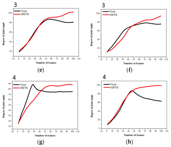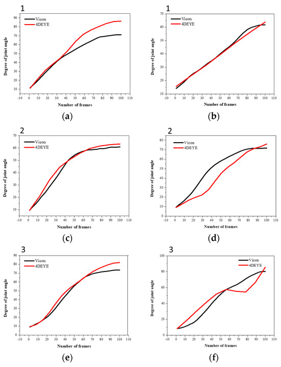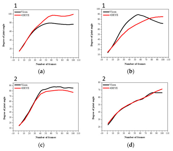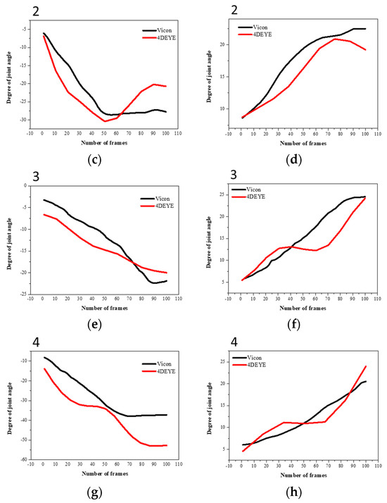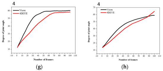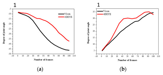 The analysis methods used for the 4DEYE and VICON systems were slightly different, resulting in some differences in angle values. This is because the operation time of 4DEYE and VICON must be set manually, not automatically, resulting in experimental errors. After the VICON device was activated, the processed data was standardized to have 100 frames. However, the data that were not processed after operation showed some significant differences in angle value compared with 4DEYE. The images for matching VICON and 4DEYE are shown in Figure 2b,c.
