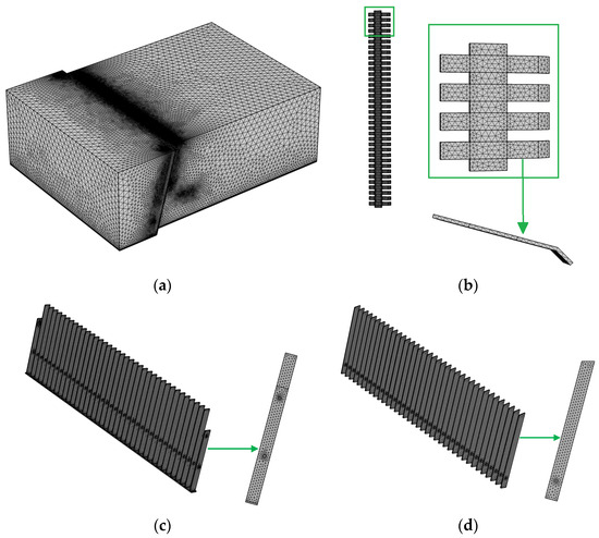 Mesh configuration: (a) for the entire WSM channel, (b) rake, (c) sub-screen, and (d) the main screen.