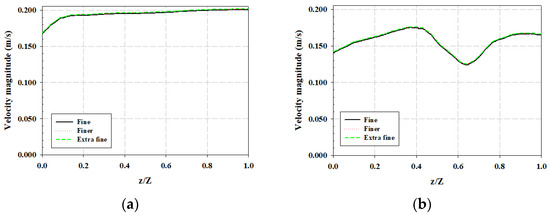 Mesh independence test at a flow velocity of 0.2 m/s for (a) upstream region (location C) and (b) downstream region (location D).