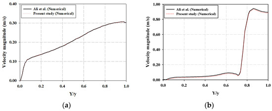 This study employed ALE two-way coupling to model the FSI between the water flow and the WSM components to analyze the screening process. For the validation of our approach, the results are compared with Ali et al. [7] in Figure 5 in terms of local velocity in the upstream and downstream channels for a 2D case of a WSM. The portions of the sewage channel before and after the WSM are called the upstream and downstream regions. The velocity is plotted at a distance (X-axis) of 0.5 m away from the WSM in the upstream region (location C) in Figure 5a. Similarly, the velocity is plotted at a distance (X-axis) of 0.5 m away from the WSM in the downstream region (location D) in Figure 5b. The consistency and quality of the results can be observed between the present study and [7]. However, a 2D model is not a reasonable solution for complex fluid flow problems, and a 3D model is a practical means to predict and visualize real physical phenomena. Specifically, a 3D model of the WSM provides a spatial map for the stress that is induced in the structure of the WSM, which highlights the locations where the stresses due to flow loading exceeded or were close to the maximum permissible values, which is impossible to identify with a 2D model. In a 3D model of a WSM, the spatial distribution of velocity and structure deformation helps identify the constraints and opportunities for design improvements.