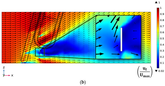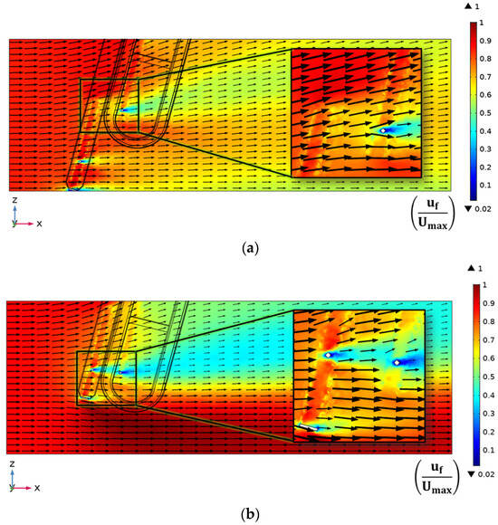 Normalized velocity contour plots at y = 0.1 m for an inlet velocity of 0.2 m/s when the rake is operational and (a) φr = −75°; (b) φr = 0°; the view of the rake has been magnified, and the arrows represent the velocity magnitude at the trailing points.