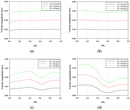 The effect of the inlet velocity on the flow distribution in the upstream and downstream regions inside the sewage channel are investigated in Figure 8a–d, which provide insights into the loading conditions on various WTP components in the vicinity of the WSM. Figure 8a shows the velocity in the region that is upstream of the WSM when the sub-screen is fully lowered. We note that at this location in the channel near the floor, the flow velocity is slightly below the inlet velocity, and as we move up the channel height, this velocity approaches the inlet velocity. However, in Figure 8b, which shows the velocity upstream of the WSM when the sub-screen is partially lowered, we note that the channel opening overcomes the flow resistance caused by the channel floor. This means that when the channel is partially lowered, there is a fully open passage at the bottom, which, according to the continuity equation (where a smaller flow cross-sectional area leads to a higher velocity), results in increased velocity near the channel floor, which counteracts the drag caused by the channel floor.