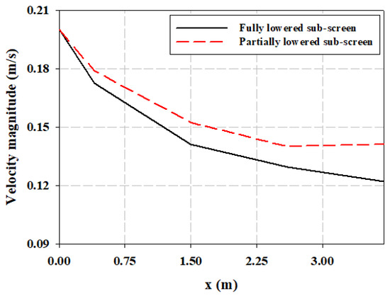 Velocity profile along the x-direction for the inlet velocity of 0.2 m/s when the sub-screen is (a) fully lowered and (b) partially lowered; the arrows represent the horizontal component of the velocity at the trailing points.