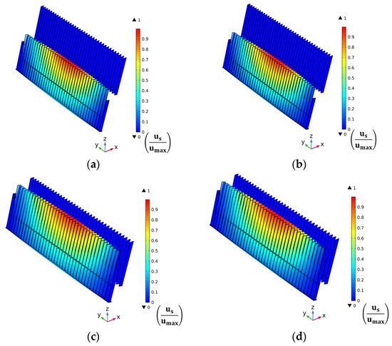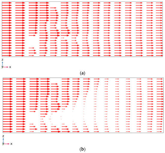 Comparing Figure 6a,b, we note that the flow separation for the partially lowered configuration is significantly larger than the fully lowered configuration of the sub-screen. The sub-screen creates a high drag because it is in front of the main screen. Consequently, a large amount of fluid is directed below the lifted sub-screen, inducing an intense flow separation between the upper and lower regions of the sewage channel. The flow separation in the partially lowered sub-screen traverses until the end of the channel compared with the fully lowered sub-screen, in which the flow is uniform over the channel cross-section at the end of the channel. The effect of this flow separation on the components at the inlet of the WTP can be clarified in Figure 7a,b, which depict the arrows for the magnitude of the x-component of the velocity for the fully and partially lowered configurations of the sub-screen, respectively. The shorter arrows indicate slower flow, and the longer arrows indicate faster flow. These arrows are plotted over the longitudinal vertical plane y = 0.1 m. The velocity along the x-direction is fairly uniform over the channel cross-section at the end of the channel when the sub-screen is fully lowered. However, the x-component of the velocity assumes separation over the channel height towards the end of the channel. This phenomenon suggests an uneven stress distribution on the components at the inlet of the WTP, which should be established to account for this uneven stress distribution.
