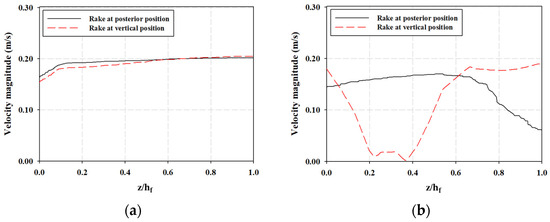 Effects of rake on the velocity magnitude at posterior position (φr = −75°) and vertical position (φr = 0°) in the (a) upstream region (location C) and (b) downstream region (location D).
