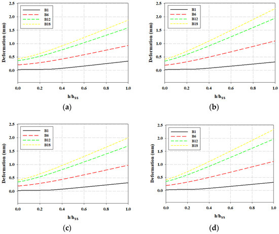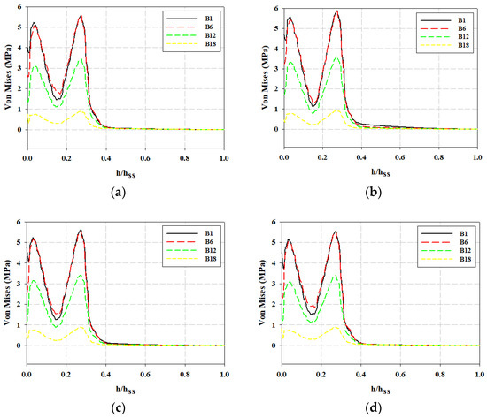The von Mises stresses on the FSI boundaries of the sub-screen were computed with the effects of the different inlet flow velocities and positions of the sub-screen. The orientation for the selected bars in Figure 17 is from the bottom to the top. The legend in the graph shows the selected bars of the sub-screen. B1, B6, B12, and B18 represent the 1st, 6th, 12th, and 18th bar of the sub-screen, respectively. h represents the displacement on the FSI boundary of the sub-screen with an initial point at the bottom. Furthermore, hₛₛ represents the total length of the FSI boundary on the sub-screen. A high von Mises stress was observed at the base of the sub-screen because of the corner acting as a stress concentrator. Similarly, high von Mises stress values also exist due to the basic structural support installed in the sub-screen. These phenomena are visible in the first and second peaks in Figure 17a,b for the fully lowered sub-screen and in Figure 17c,d for the partially lowered sub-screen. This contrasts with the 2D study conducted by Ali et al. [7], in which the von Mises stress on the sub-screen consistently decreased along a sub-screen bar from bottom to top. This observation stemmed from the fact that their sub-screen was mounted at the floor of the water stream and a horizontal supporting rod for the sub-screen was not considered in their geometry.